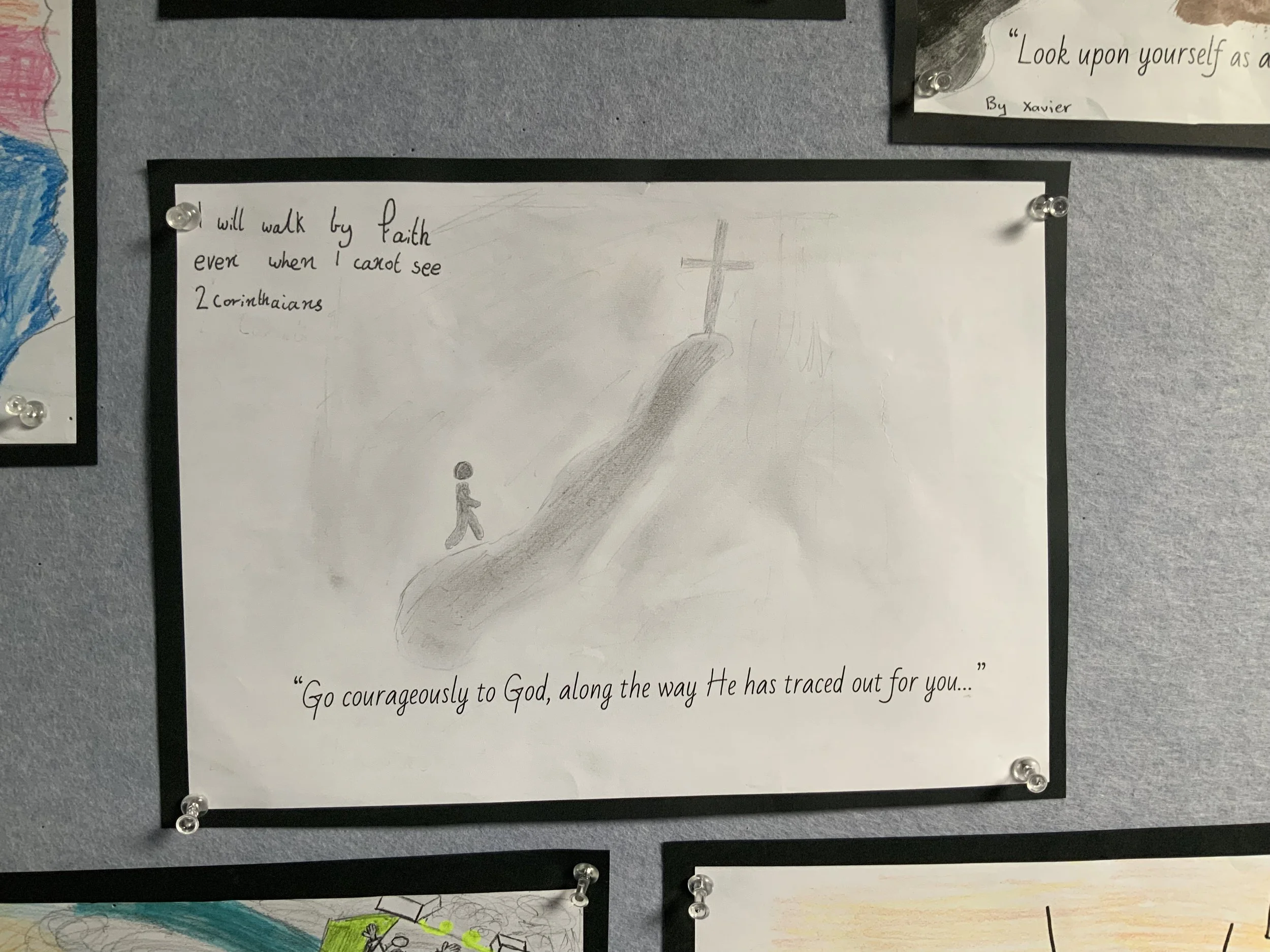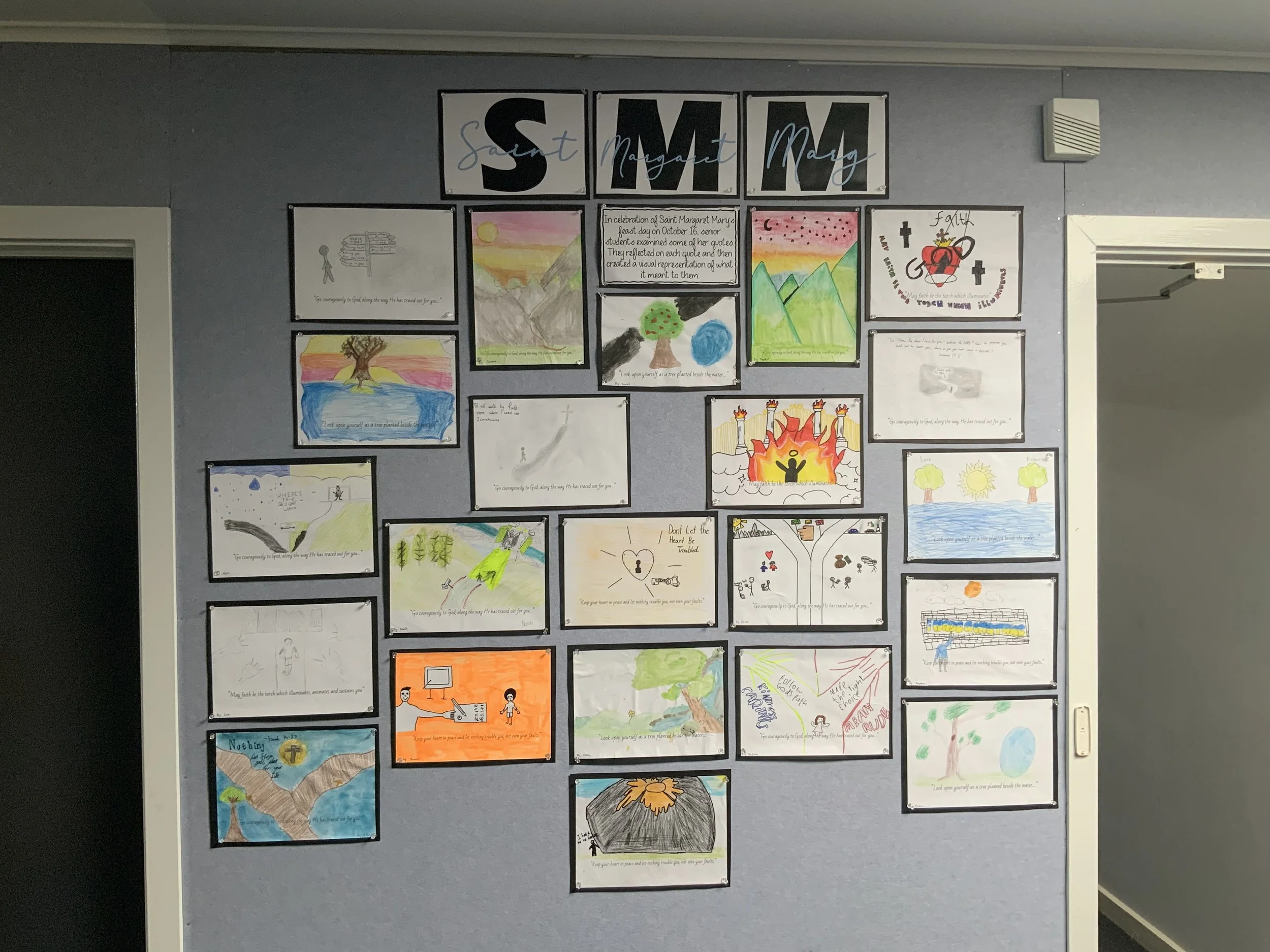 New pinboards, religious artwork, and the framed image of St Margaret Mary in our administration area